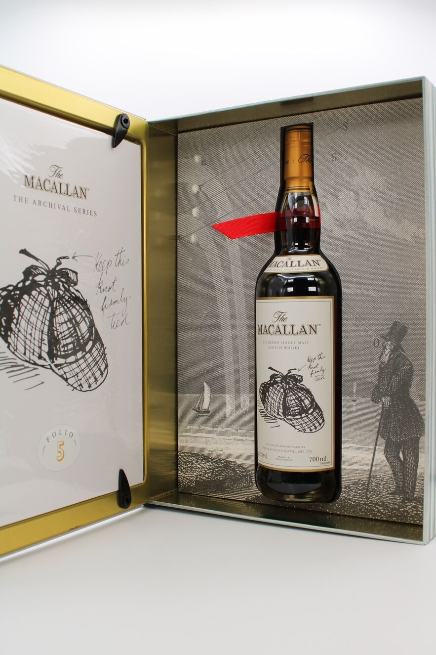 The Macallan Folio 5 commemorates an advert featuring the tale of a “Luggy Bonnet” with the words “Keep this knot firmly tied”. The sketched image recollects a scene of acquaintances at the end of a day on Speyside when one sportsman talks of a so-called “disaster”, missing the opportunity of a dram of The Macallan from the "Laird" as a result of his hat covering his ears