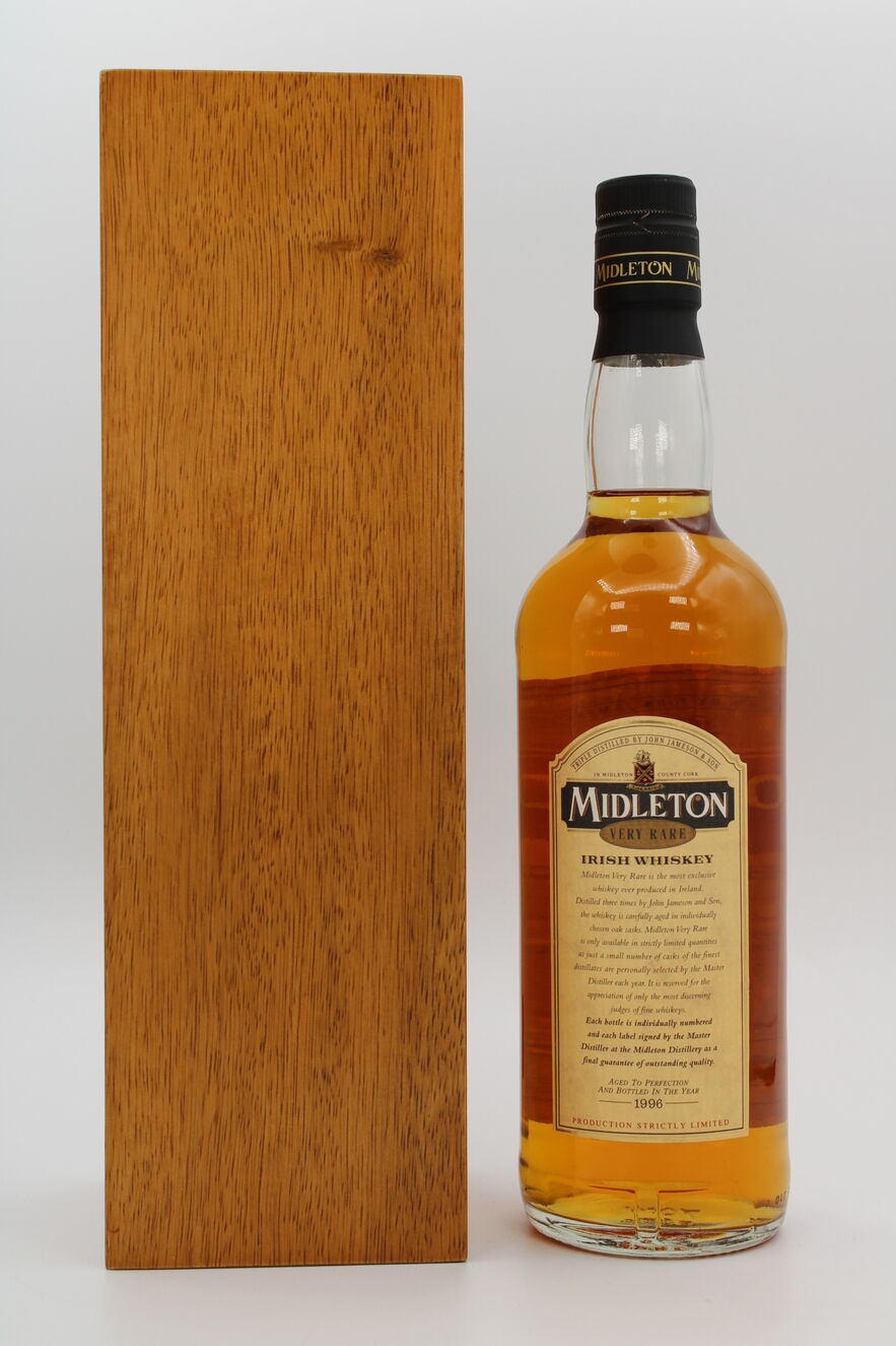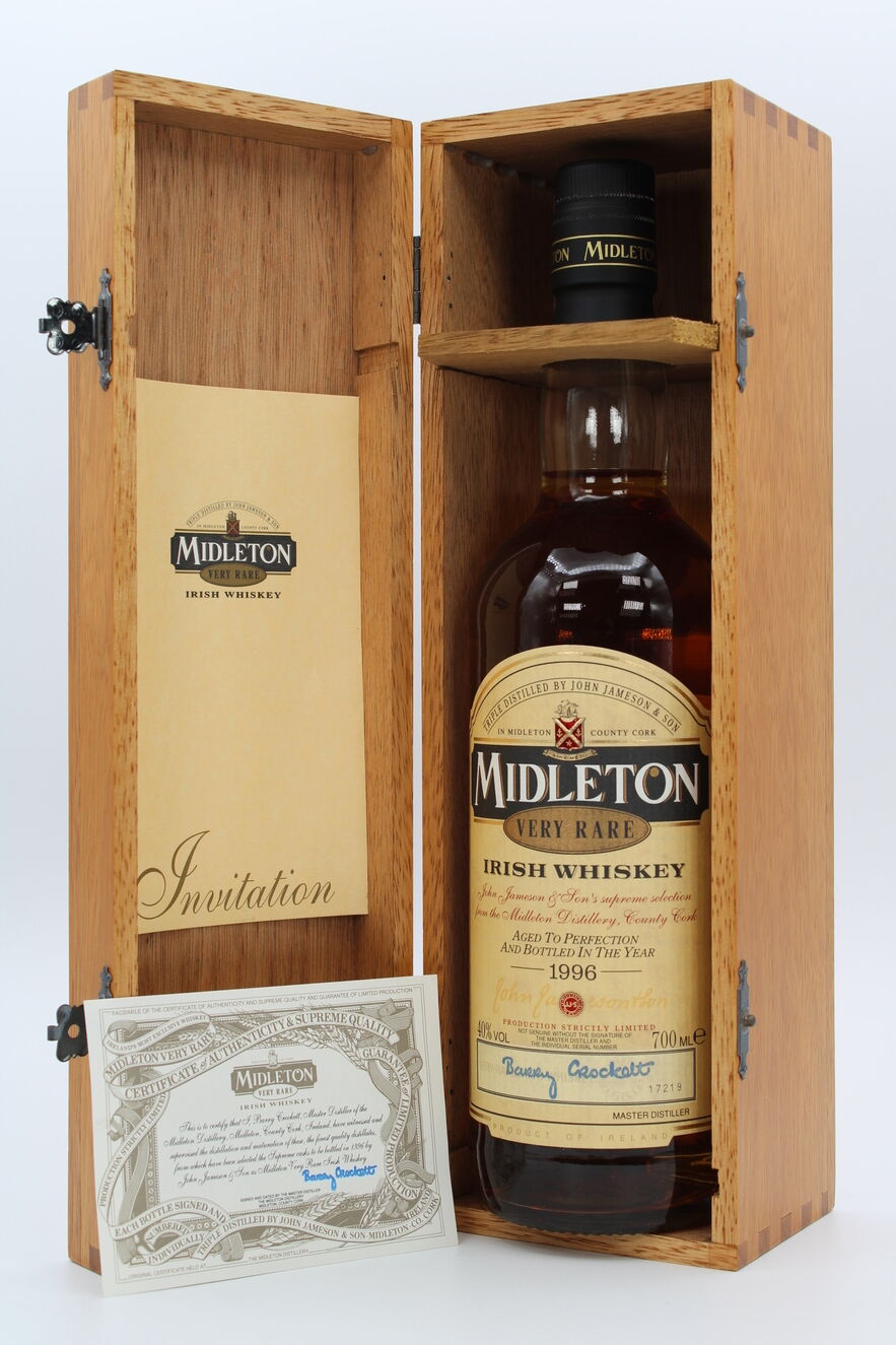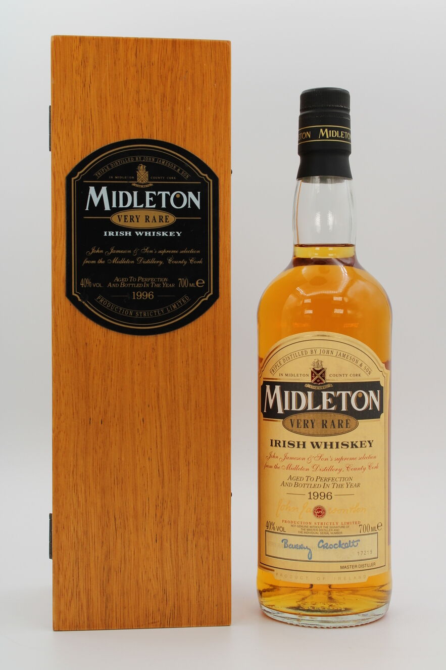 Midleton Very Rare Irish Whisky is a supreme blend of carefully chosen whiskeys distilled three times and aged in individually selected oak casks. Bottled in 1996 and signed by Master Distiller Barry Crockelt.