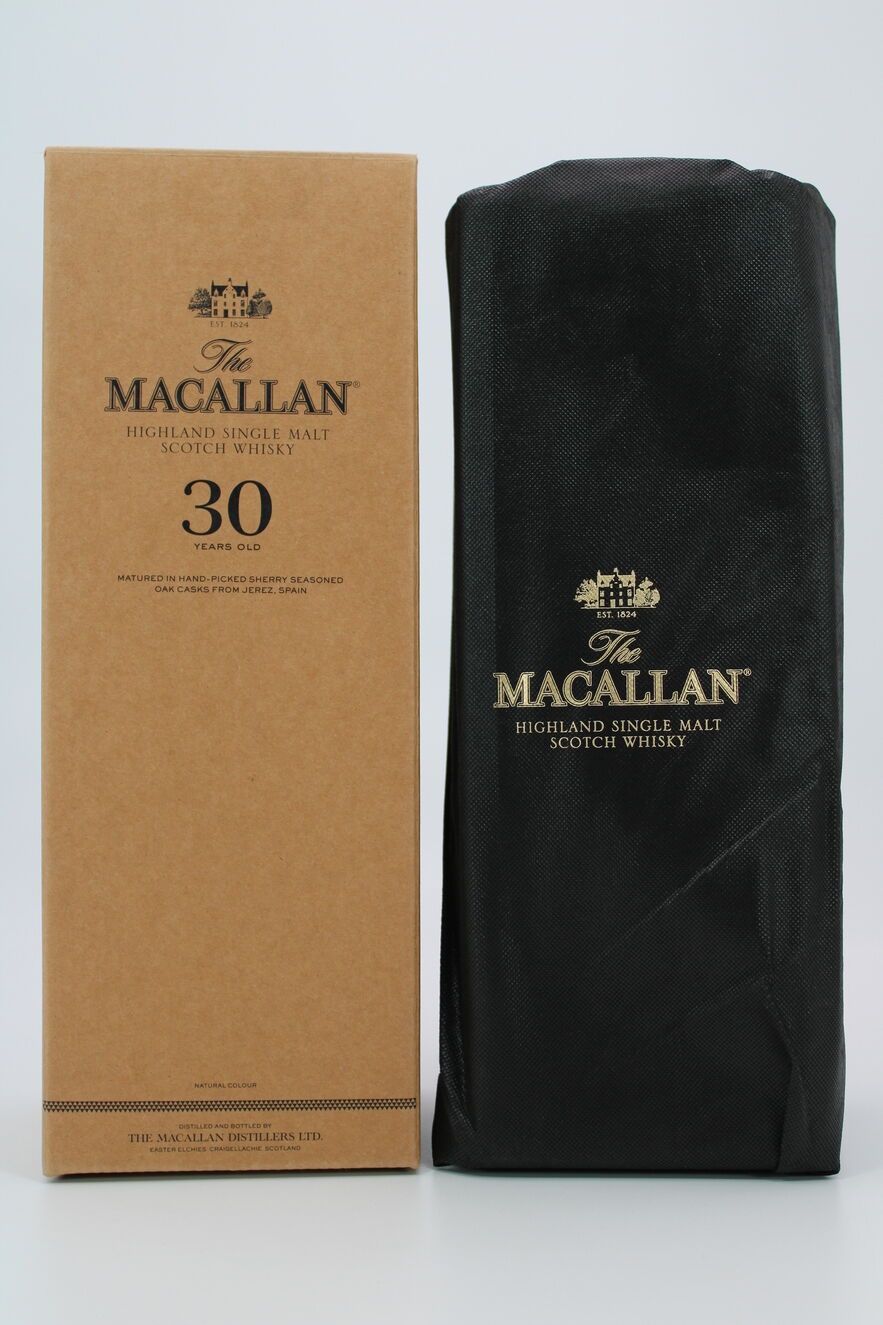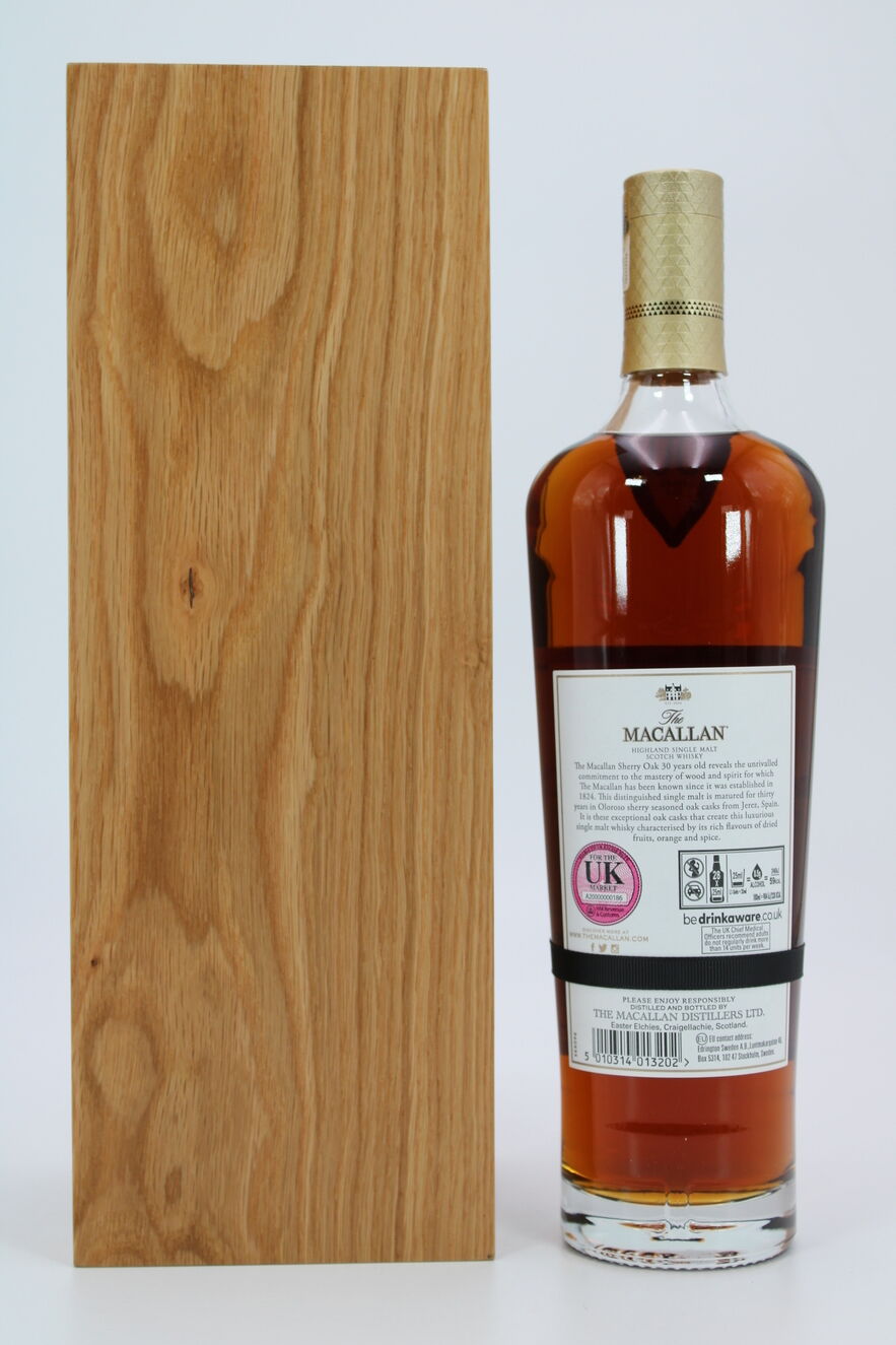 A Macallan Sherry Oak 30 year old, forms part of the Sherry Oak range which features a series of single malt whiskies matured exclusively in hand-picked sherry seasoned oak casks from Jerez for richness and complexity.