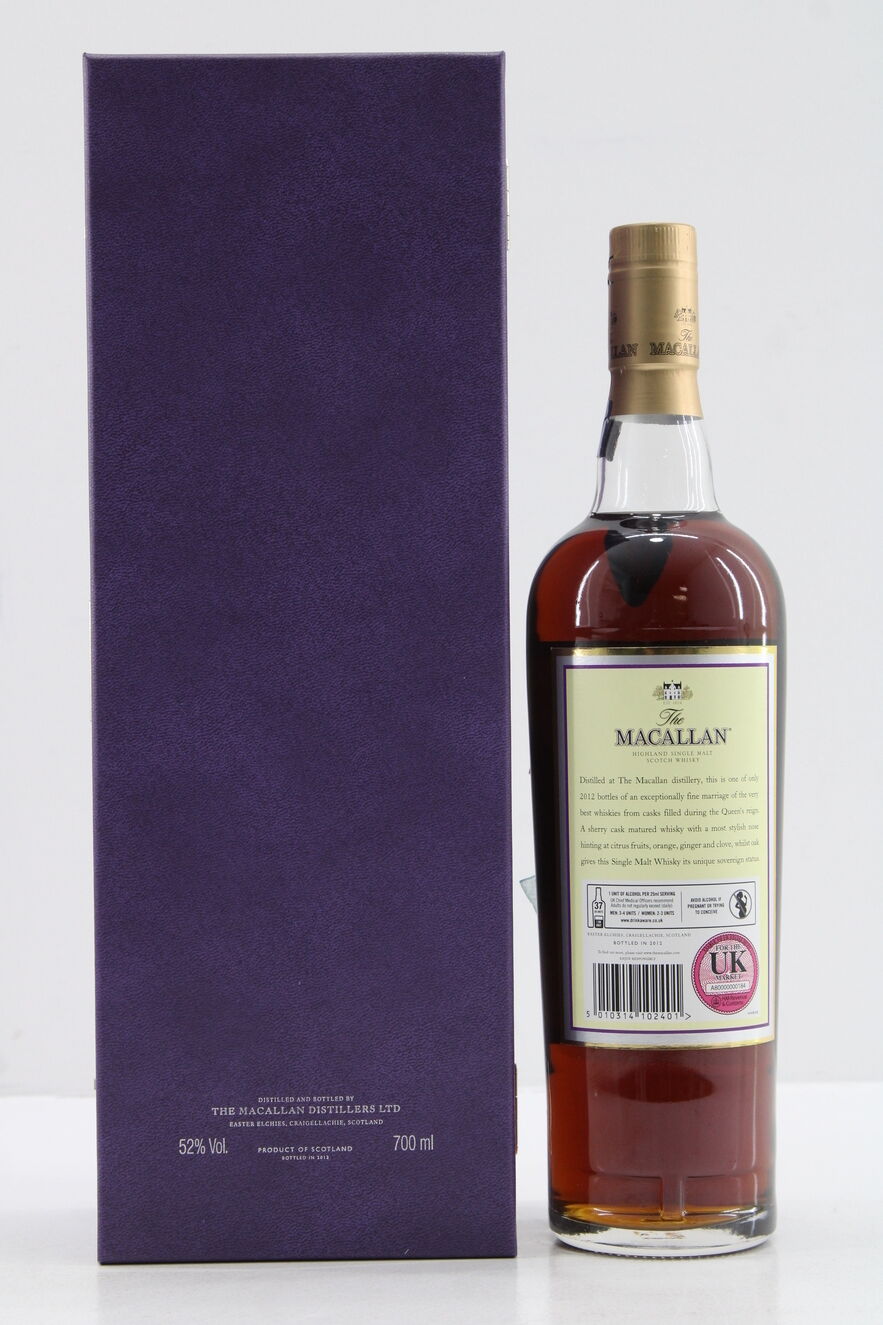 This exceptionally rare and sought after Speyside malt was distilled and bottled by Macallan to commemorate 60 years of the Queen, from 1952 to 2012, in her Diamond Jubilee. The specially chosen whisky was drawn from two casks on 6th February, the Queen's accession and the first week in June.
