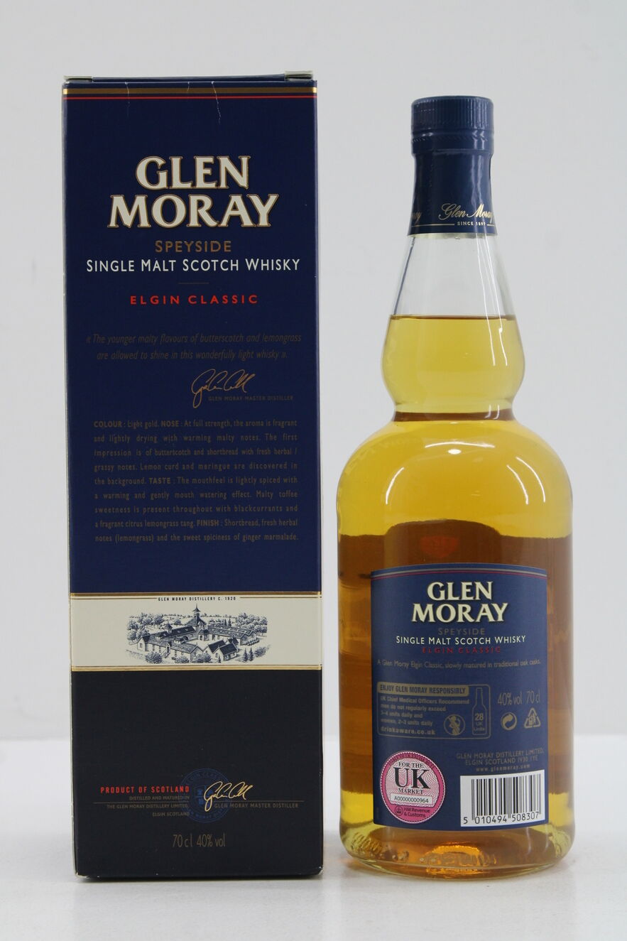 A bottle of Glen Moray Elgin Classic single malt whisky.