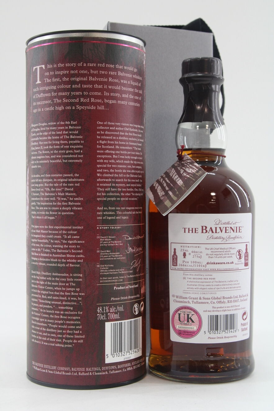 The story of David C Stewart and the creation of two extraordinary red roses. Inspired by the history of Balvenie castle, this story celebrates the story of the rose, the desire of our visitors for a distillery exclusive and the romance in creating a new whisky. The Second Red Rose is finished in Australian Shiraz casks, for an elegant dram brimming with notes of fresh, ripe fruits and delicate spice.