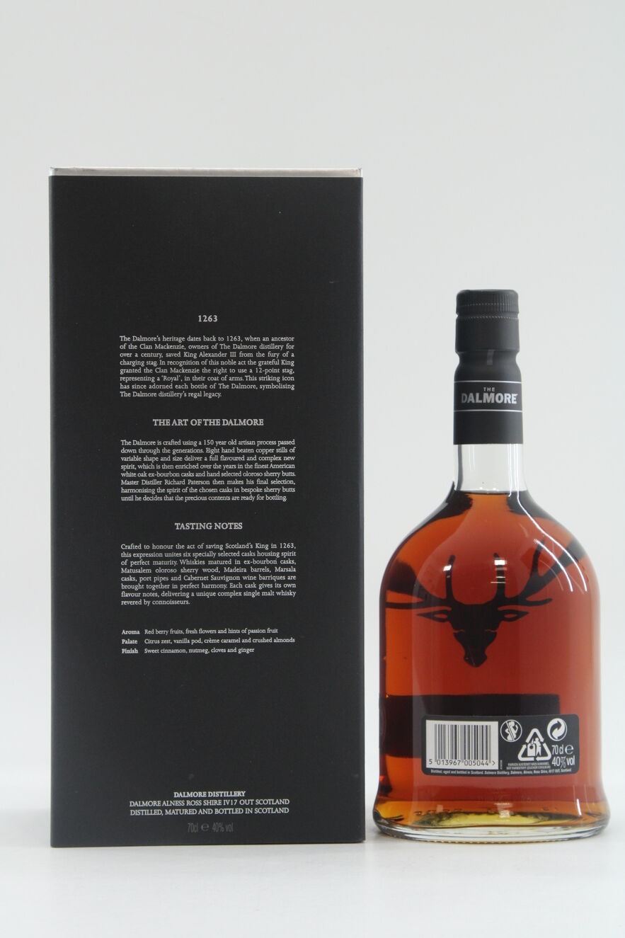 A bottle of Dalmore King Alexander III created by Master Distiller Richard Paterson who selected 6 casks of differently aged Dalmore malts matured in wine, Madeira, sherry, marsala, Kentucky bourbon and port casks.