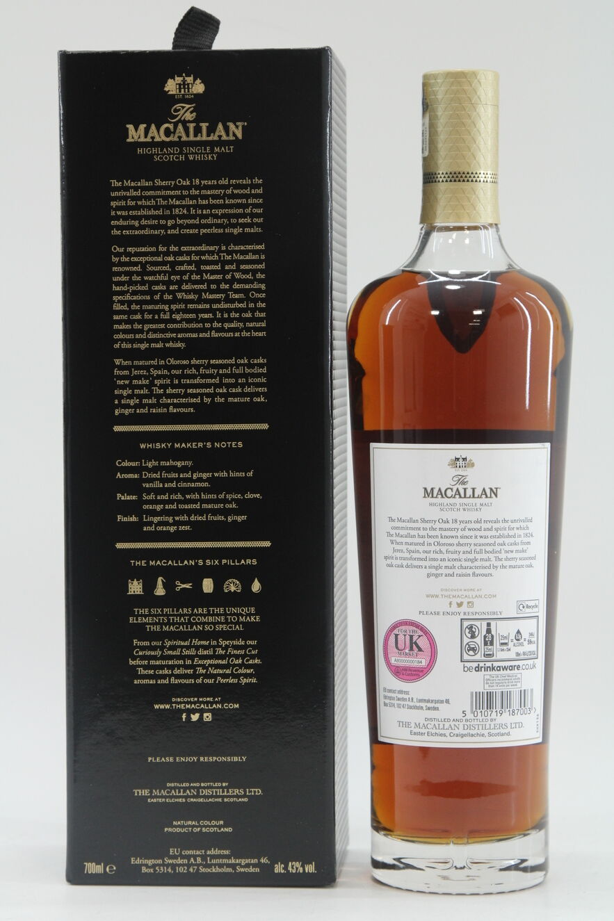 The Macallan Sherry Oak 18 Years Old 2022 release is part of the Sherry Oak range which features a series of single malt whiskies matured in hand picked sherry seasoned oak casks from Jerez for richness and complexity.