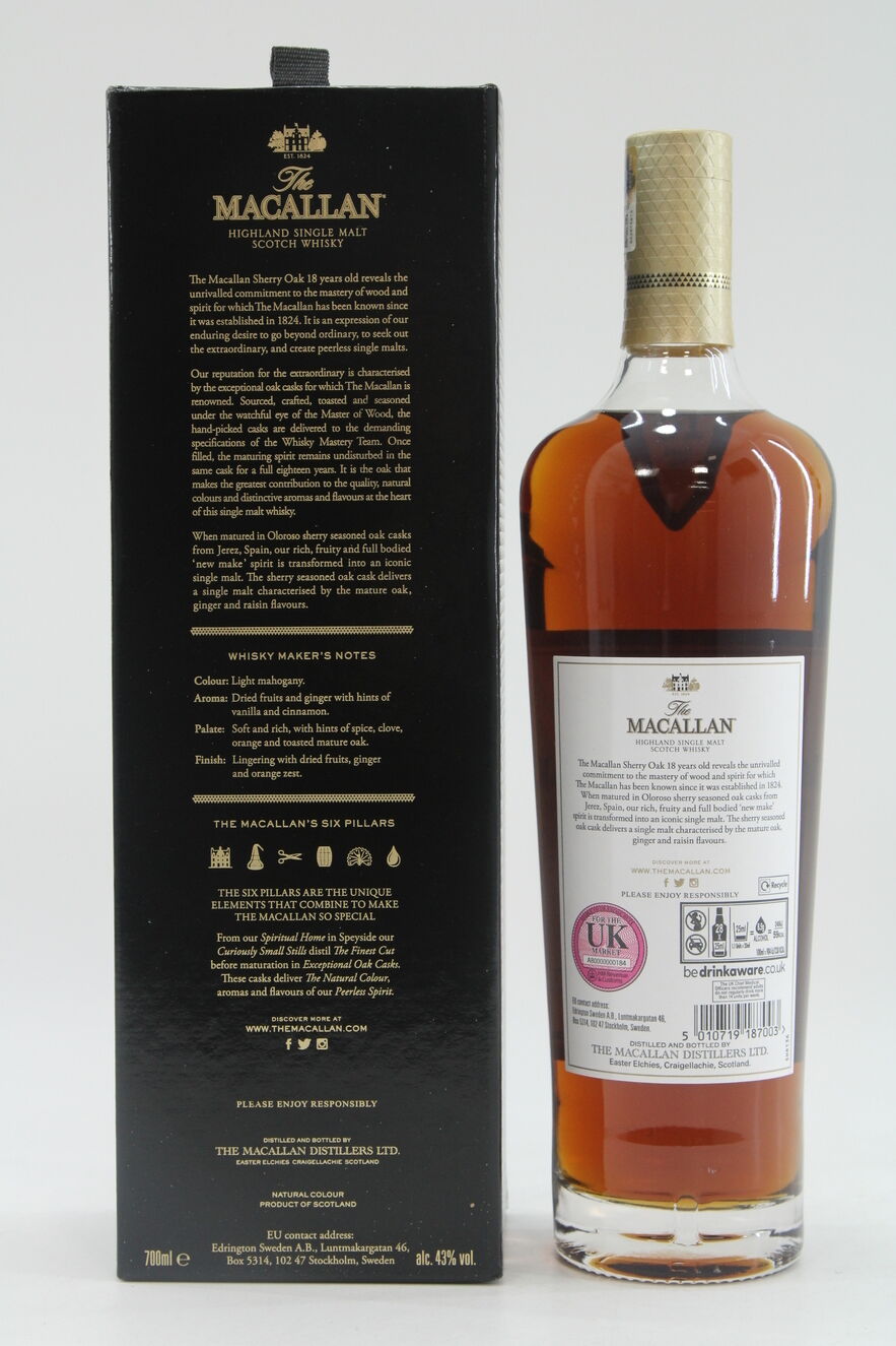 The 18 year old single malt Macallan has been matured in hand-picked, sherry seasoned oak casks from Jerez, Spain.