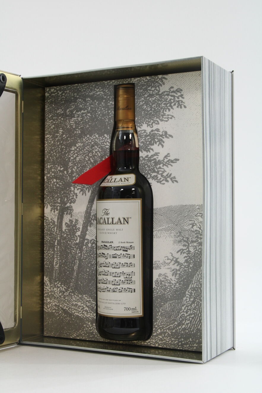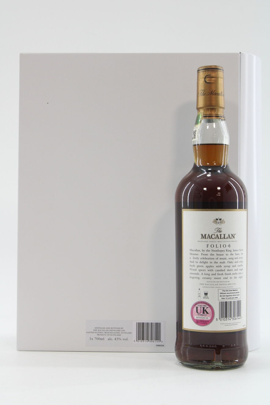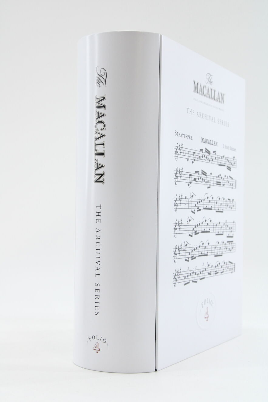 Folio 4 features an advertisement including a strathspey composed by James Scott Skinner (1843-1927). The ad notes that Skinner, "The Strathspey King", was moved to music by the lilting flavour and melting resonances of a tumbler of his favourite malt whisky - The Macallan.